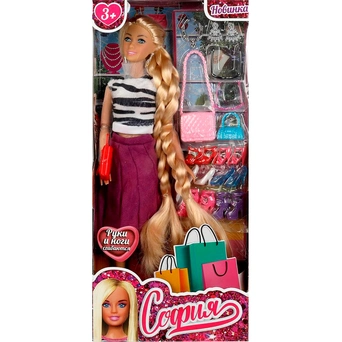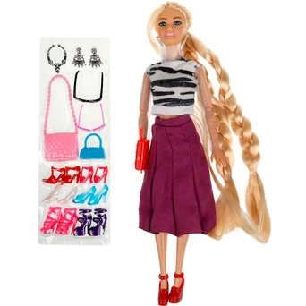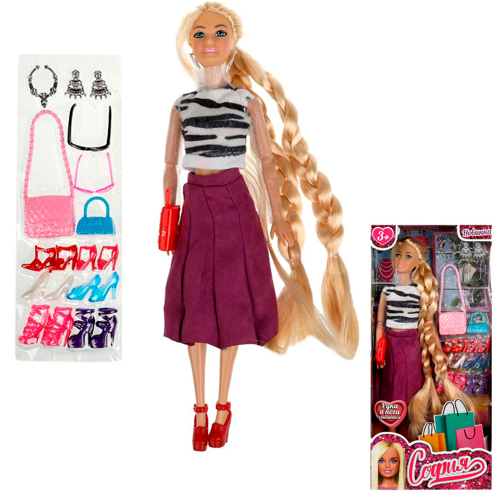 Комплектация: кукла - 1 шт, 3 сумочки, 6 пар обуви, 2 пары очков, колье, серьги