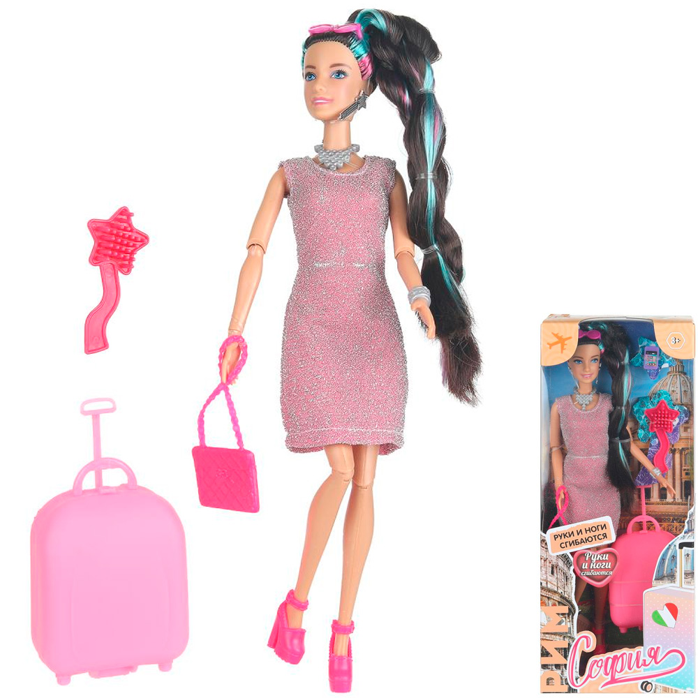 Комплектация: кукла - 1 шт, расческа - 1шт, чемодан - 1шт, телефон - 1шт, сумочка - 1шт, очки - 1шт