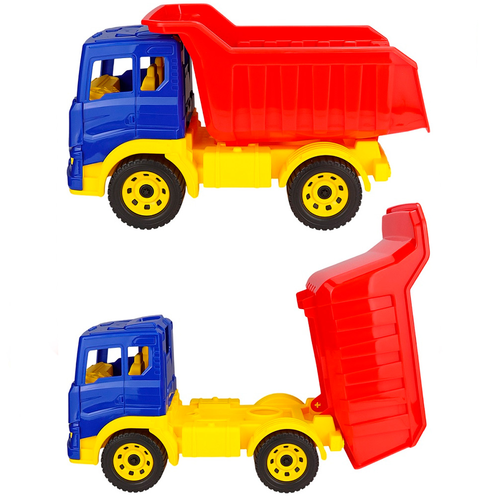 - Развивающий эффект: играя с грузовиком, малыш будет тренировать координацию движений, мелкую моторику и воображение. Откидывающийся кузов добавит реалистичности игровым сценариям.