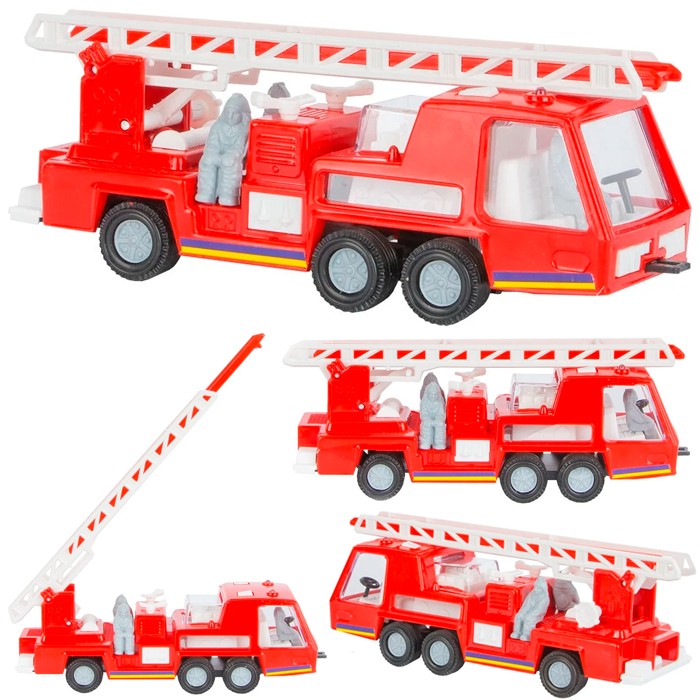 • Яркая модель представляет собой копию пожарного автомобиля, оснащённого выдвижной лестницей.