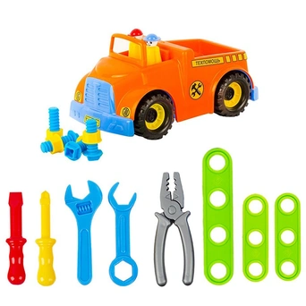 Комплектация: машинка - 1 шт., фигурка - 2 шт., набор инструментов (плоскогубцы, 2 гаечных ключа, 2 отвёртки, 3 пластины, болты и гайки - 8 шт.)