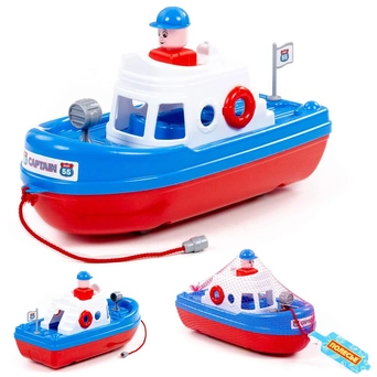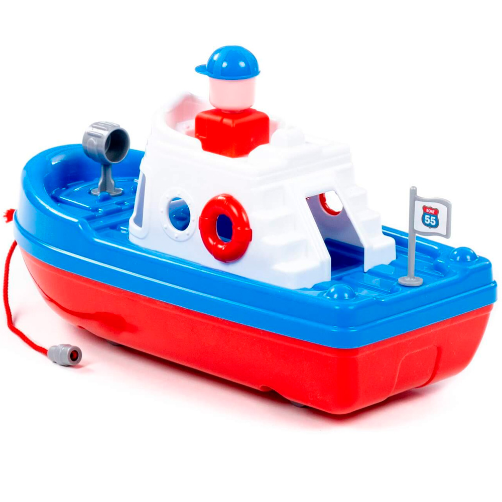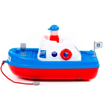 Конструкция корабля предполагает наличие верёвочки, за которую ребёнок сможет катать игрушку по воде. На кабине катера располагается фигурка человечка, которая разнообразит игру и сделает ее еще интереснее.