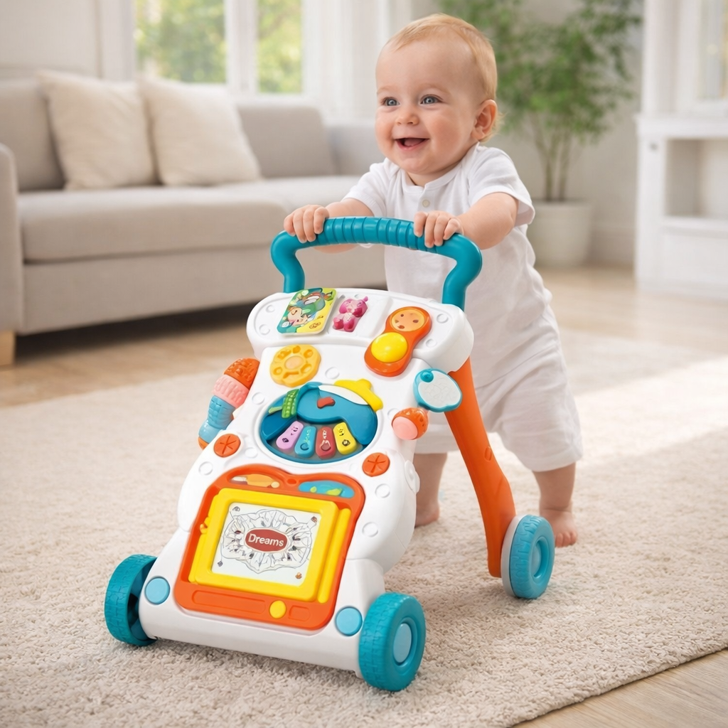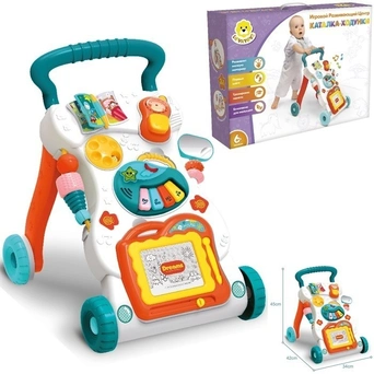 • Каталка оснащена различными интерактивными элементами, а в процессе игры с ней малыш будет развивать координацию, моторику, равновесие, и его движения станут более четкими.