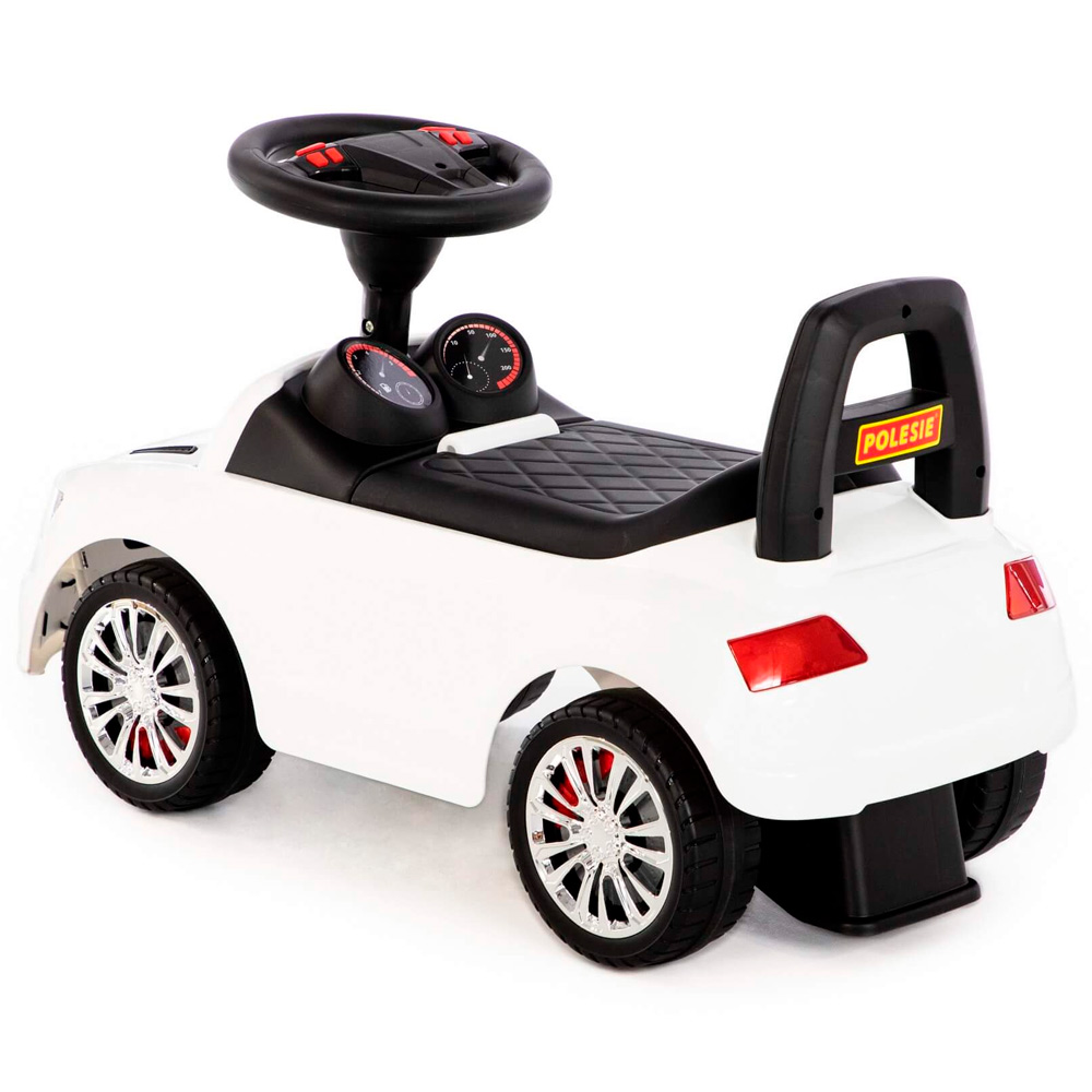 Функционал: оборудован рулевым управлением, звуковыми эффектами, спинка, багажник. Руль имеет 4 режима: сирена (3 звука), клаксон, звук двигателя, сброс звуковых эффектов.