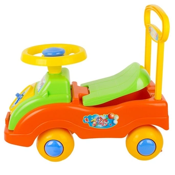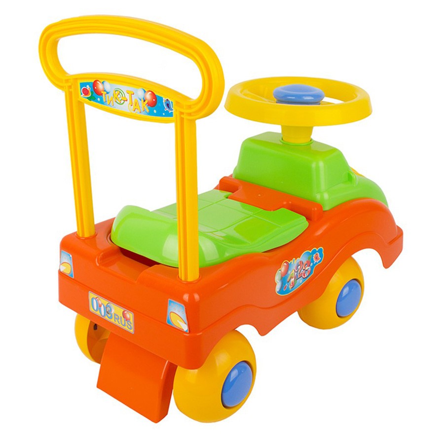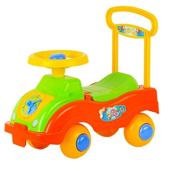 Каталка-машинка представляет собой пластиковый толокар в виде яркого автомобиля обтекаемой формы с мощным основанием и рулевым управлением. Оснащена музыкальным модулем. Она проста и удобна в управлении: необходимо поворачивать руль и отталкиваться ногами. Прочная пластиковая рама имеет небольшой вес, а широкие колеса гарантируют устойчивость. Такая каталка способствует развитию опорно двигательного аппарата ребенка, укреплению суставов и координации в пространстве. Катание на таком толокаре для ребенка будет одновременно увлекательным и абсолютно безопасным. Четыре широких колеса из пластика делают машину устойчивой к опрокидыванию, спереди и сзади есть защита от попадания предметов под нее. Руль поворачивается на 2 стороны. Машинка -