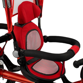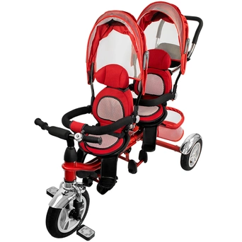 - Удобство для мамы: складной тент колясочного типа защитит детей от солнца и ветра, а ручка позволит управлять велосипедом и контролировать движение. Пластиковые педали и поворотный механизм делают управление простым и лёгким.