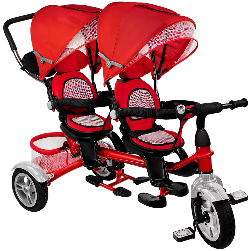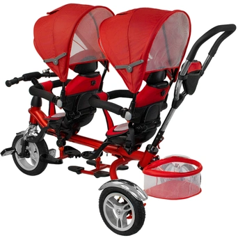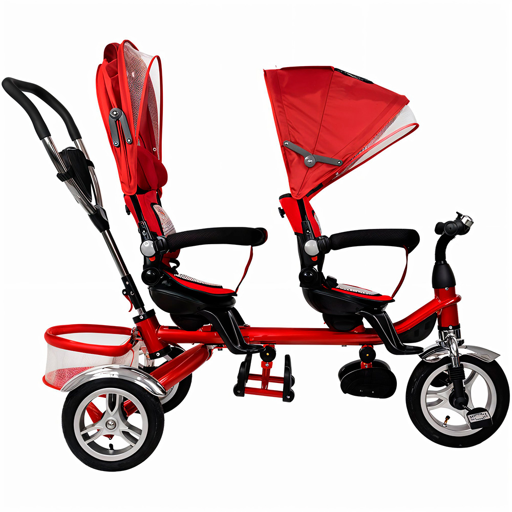 - Функционал: трёхколёсный велосипед с ручкой для двоих детей