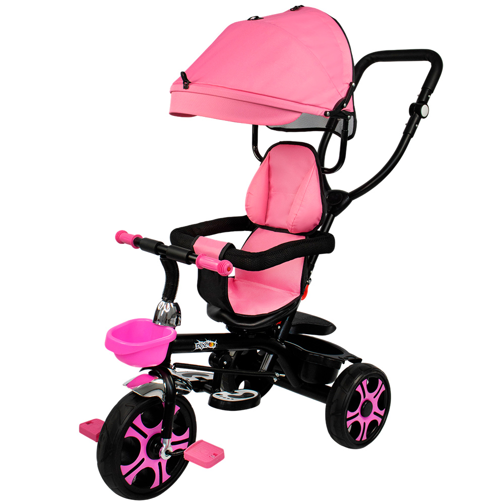 - Удобство для мамы: складывающиеся подставки для ног и поворотное сиденье на 360 градусов делают велосипед универсальным — ребёнок сможет сидеть как лицом к маме, так и спиной. Две пластиковые корзины пригодятся для игрушек и других мелочей.