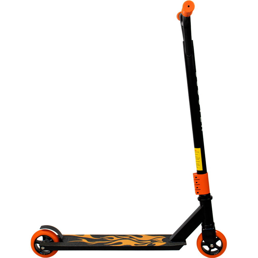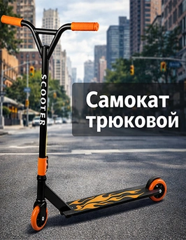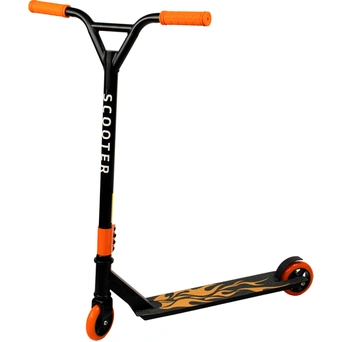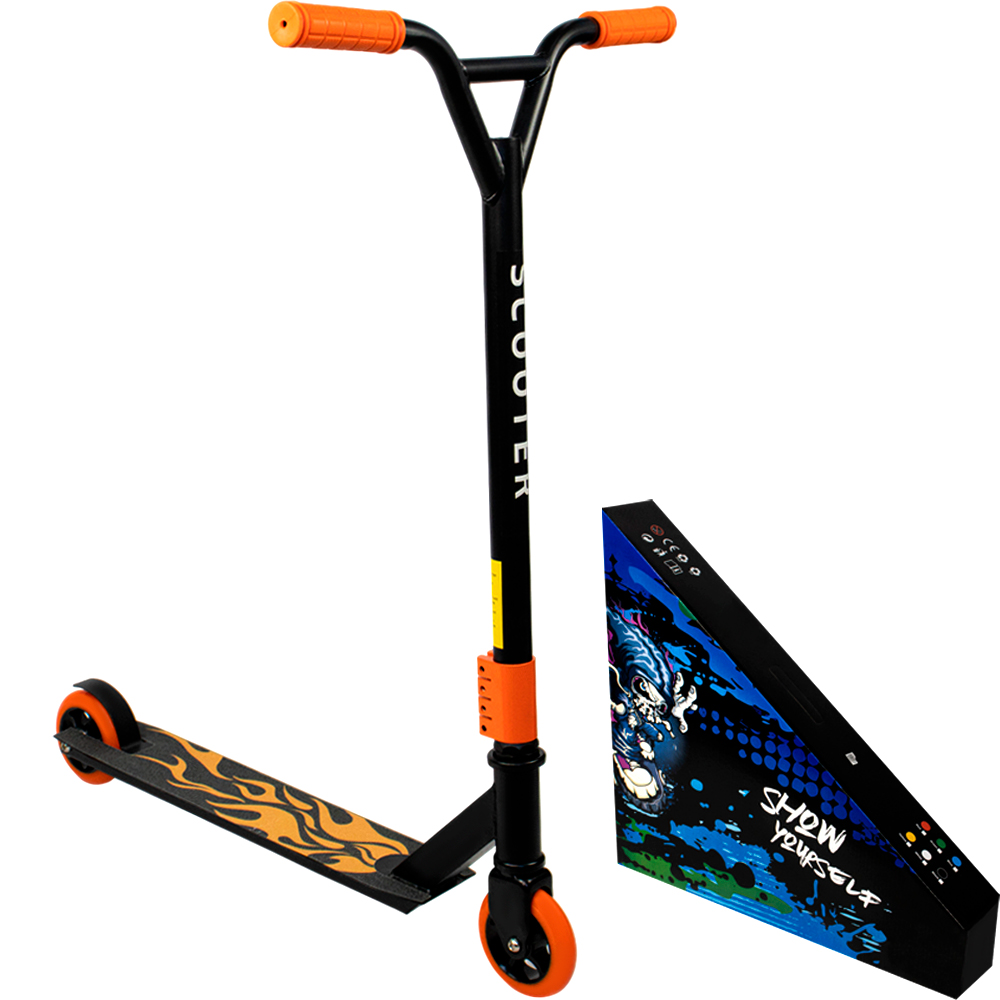 Стильный двухколёсный самокат с трюковыми колёсами.