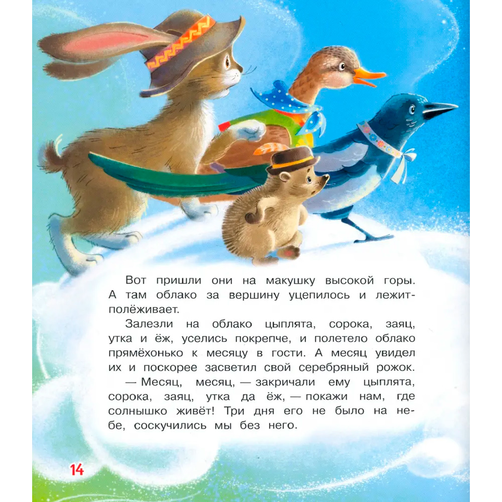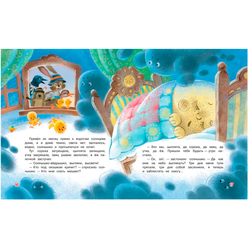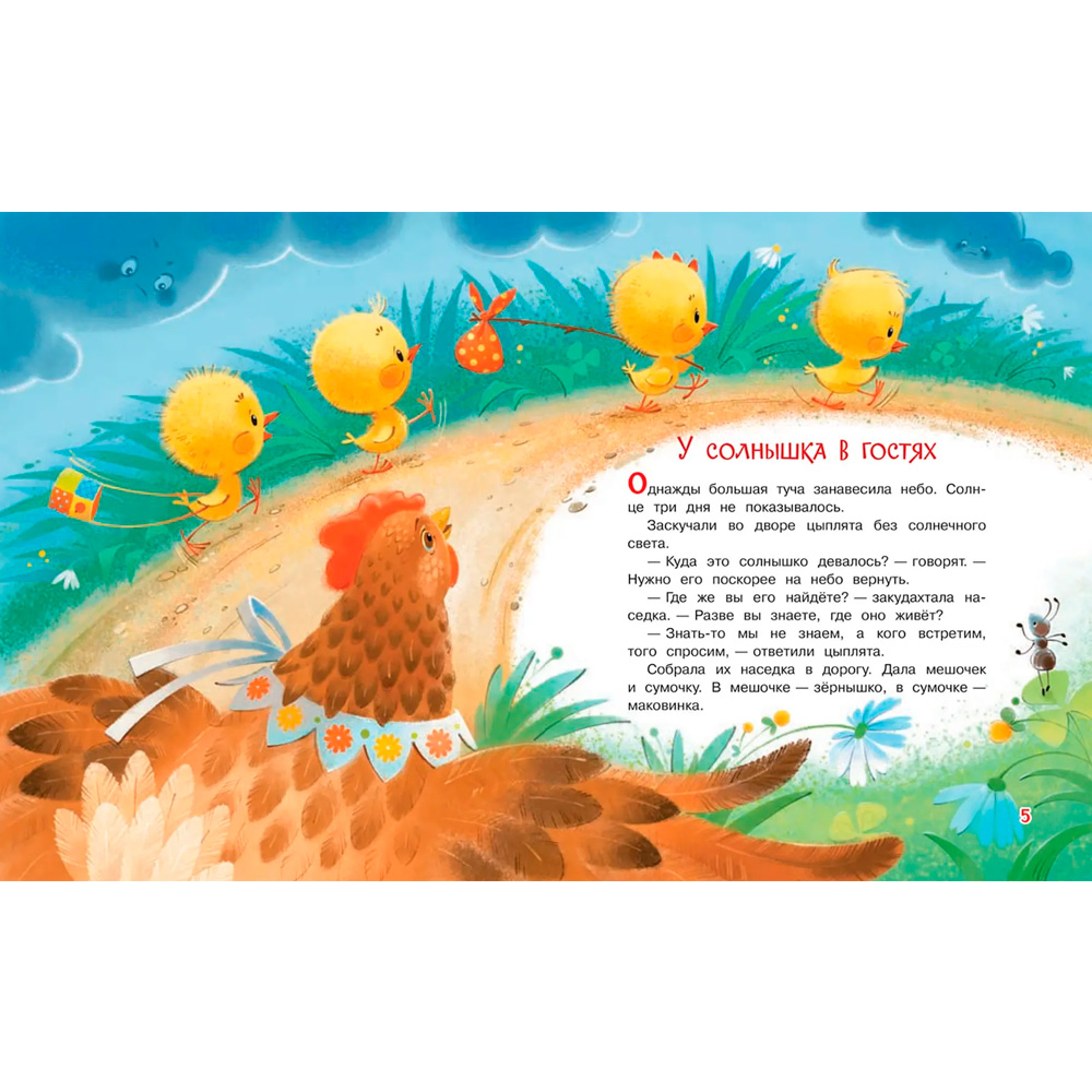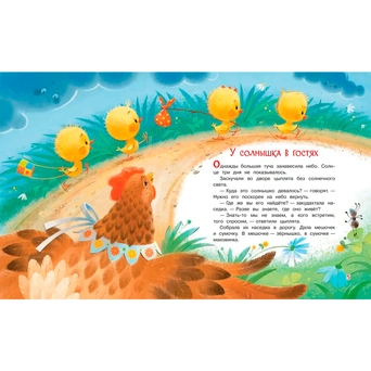 В этой книге вы прочитаете малышам две народные сказки в переводе Софьи Могилевской: словацкую "У солнышка в гостях" - как отважные цыплята отправились на поиски солнышка, спрятавшегося от туч, и украинскую "Колосок" - о ленивых мышатах и трудолюбивом петушке.