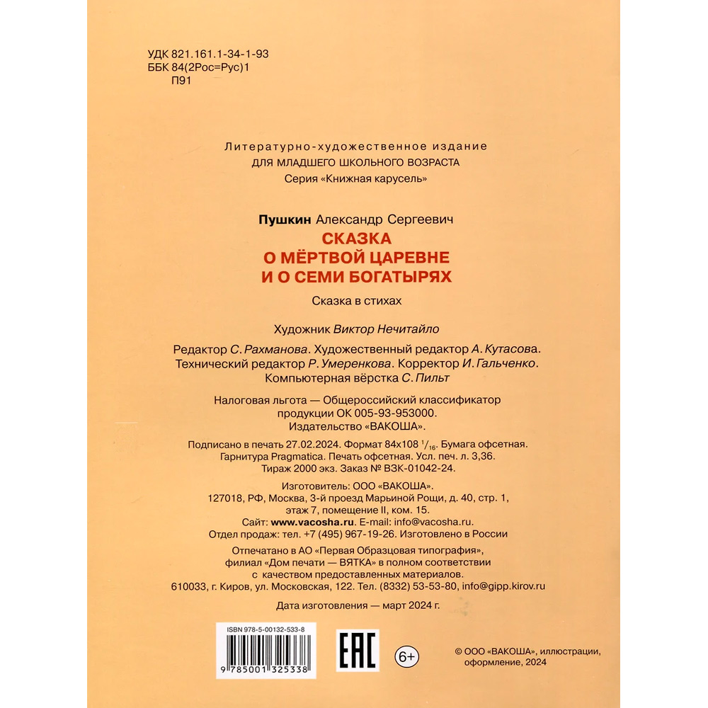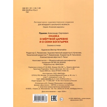 В сборник вошла известная и увлекательная сказка в стихах русского поэта-классика А. С. Пушкина, основанная на народном фольклоре.