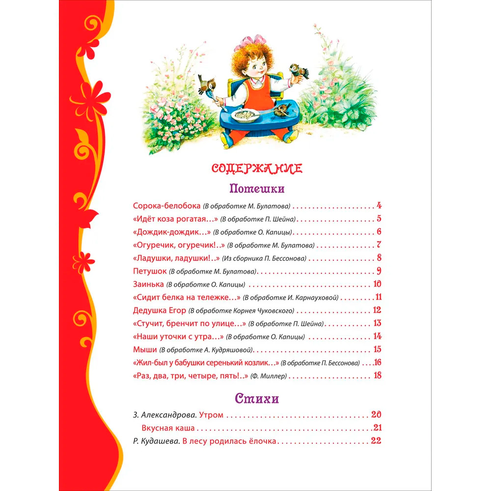В замечательную книгу для юных читателей "Любимая книга малышей" вошли народные потешки, сказки, колыбельные песенки, стихи лучших русских поэтов. Произведения адресованы малышам от года до трех лет. Издание снабжено красочными иллюстрациями, которые сделают процесс чтения еще более интересным и увлекательным. Чтение способствует развитию образного мышления и фантазии, побуждает к действиям, учить этикету и дает первые базовые понятия и сведения об окружающем мире.