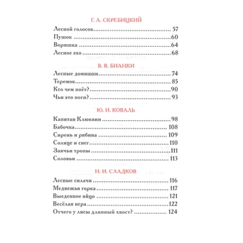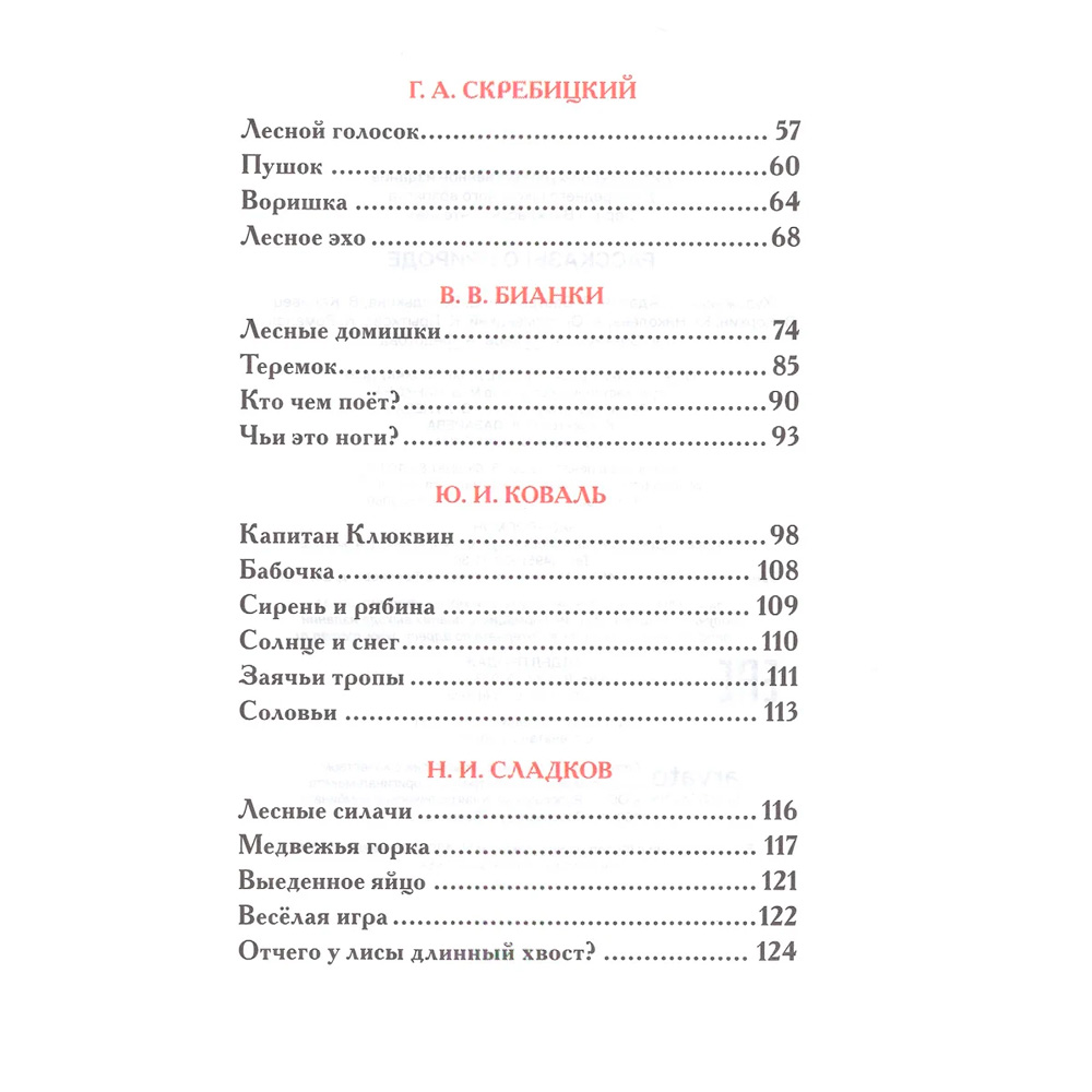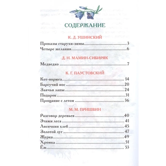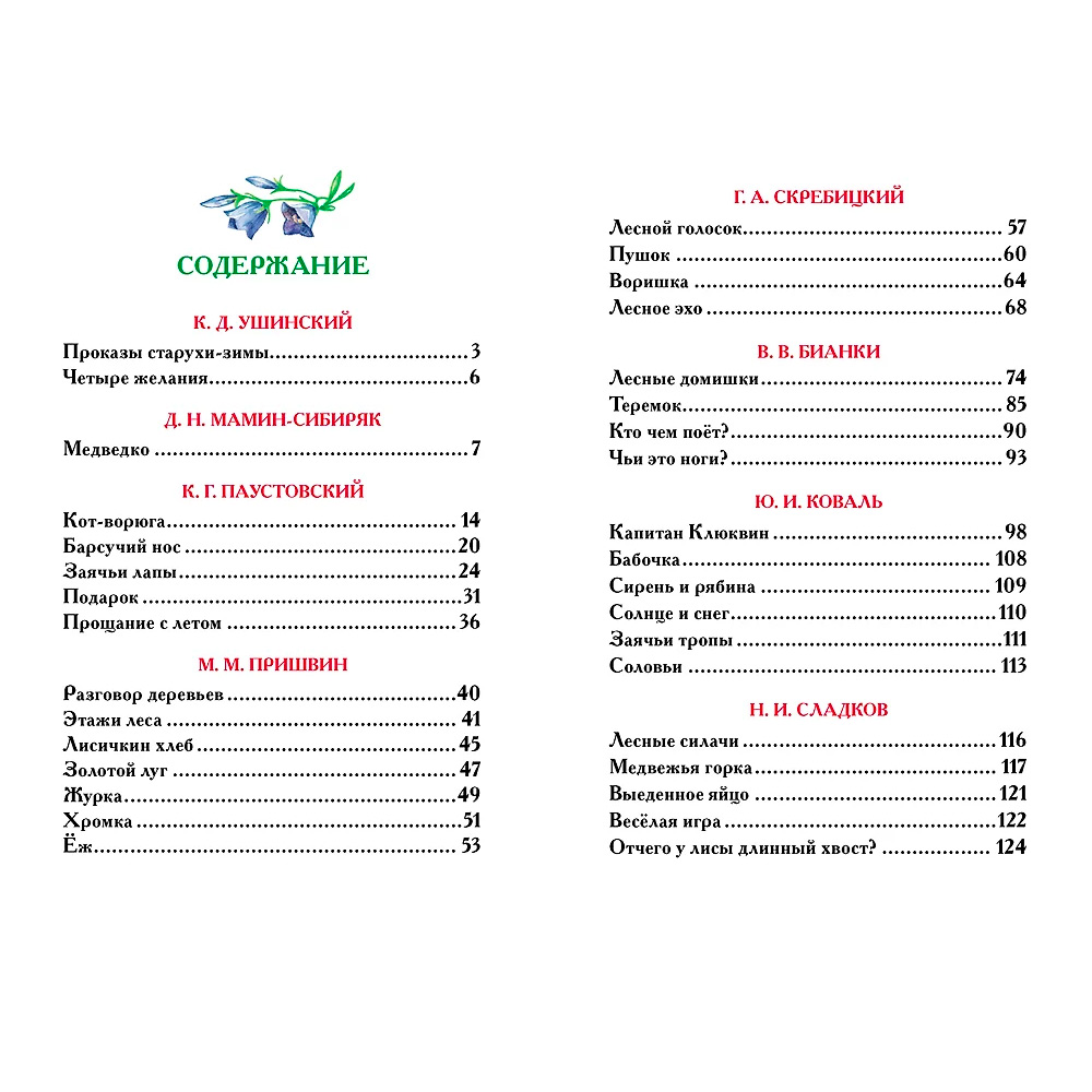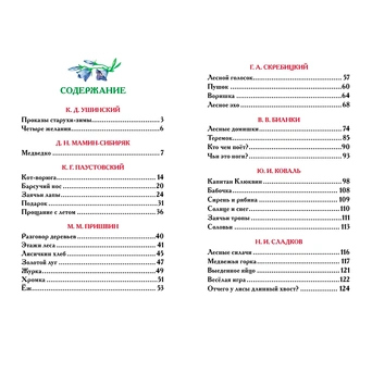 Автор: Константин Ушинский, Дмитрий Мамин-Сибиряк, Константин Паустовский, Михаил Пришвин, Георгий Скребицкий, Виталий Бианки, Юрий Коваль, Николай Сладков
