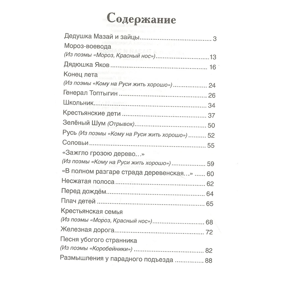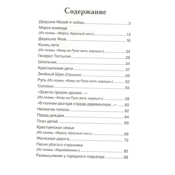 В сборник вошли избранные стихотворения Н. А. Некрасова, рекомендованные для чтения в начальной и средней школе: «Дедушка Мазай и зайцы», «Школьник», «Крестьянские дети», «Зеленый Шум», «Несжатая полоса», «Перед дождем», «Железная дорога» и многие другие.