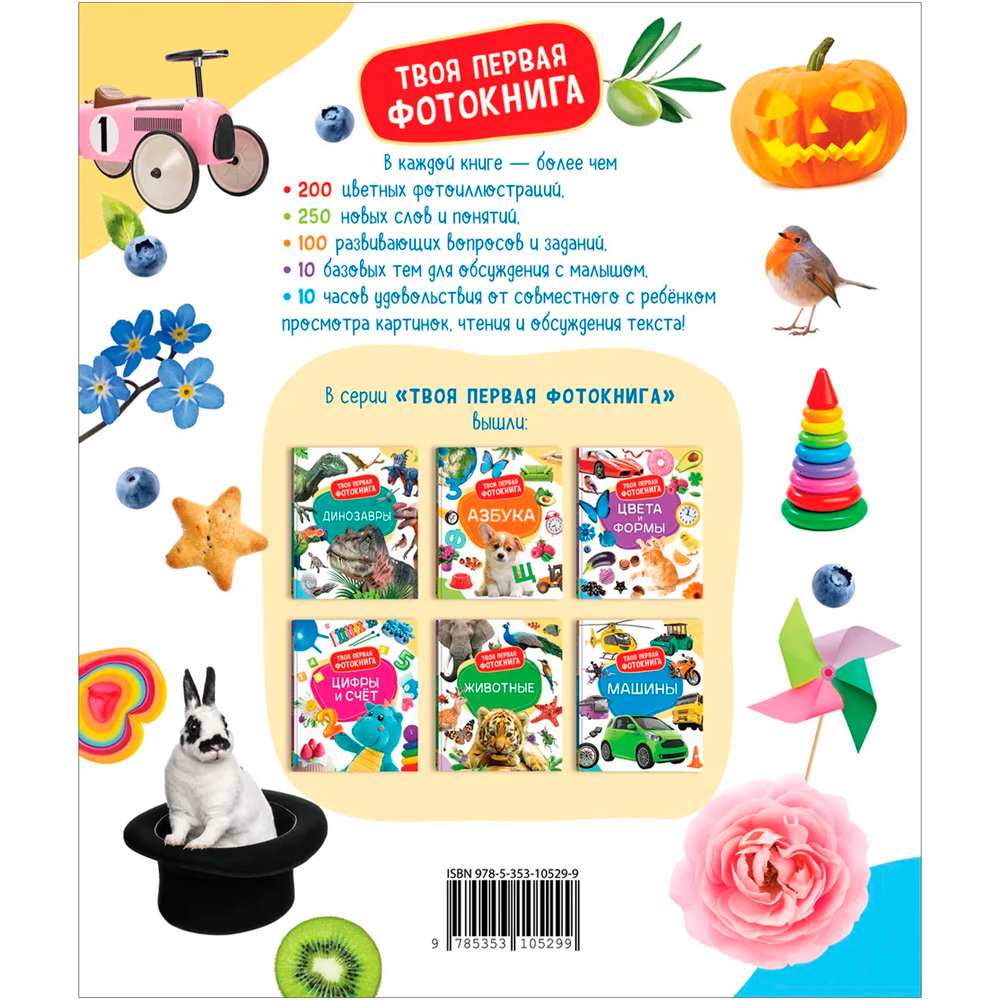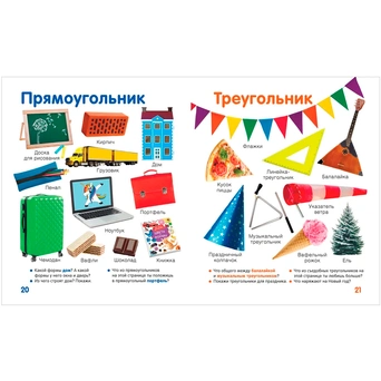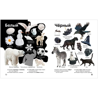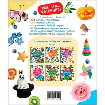 Красочная и познавательная книга содержит более двухсот фотографий, познакомят ребенка с миром вокруг, покажут окружающие его предметы и при этом научат различать более десяти цветов и множество форм (не только круг, квадрат, треугольник, но и многие другие).