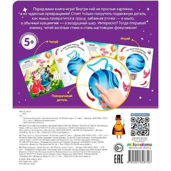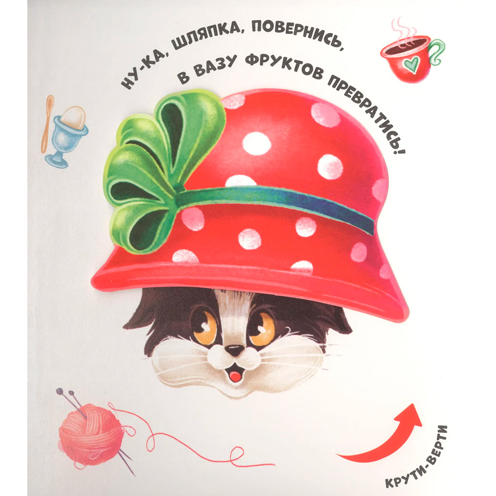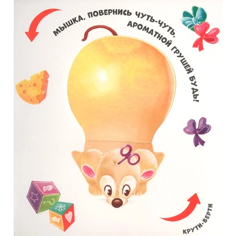 - на каждом развороте — добрый стишок и вращающийся элемент, благодаря которому одна забавная и милая фигурка становится другой;