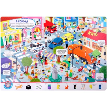 Можно рассматривать картинки, придумывать истории, искать загаданные предметы, находить похожие картинки.