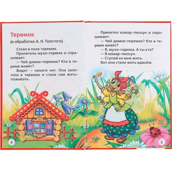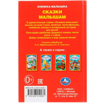 "Книжка-малышка" - серия красочно оформленных книг для малышей небольшого формата - ее удобно брать с собой на прогулку, в поездки или к врачу. В мерию вошли известные произведения в обработке для самых маленьких читателей - народные сказки, потешки, стихи и песенки. Чтение книг тренирует память, логическое, образное и ассоциативное мышление. Легкий слог и простые сюжеты будут понятны любому малышу. Красочные иллюстрации раскрывают воображение ребёнка. Прекрасные тексты, яркие иллюстрации и крупный шрифт помогут вашему ребёнку развить творческое мышление, внимание и не дадут скучать.