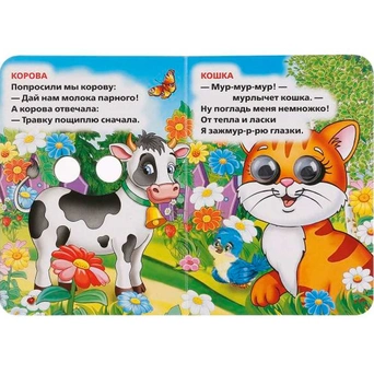 На каждой странице у героев на месте глаз - прорези, на последней странице - пластиковые глазки с подвижными зрачками.