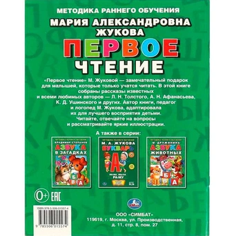 "Первое чтение" М.Жуковой - замечательный подарок для малышей, которые только учатся читать. В этой книге собраны рассказы известных и всеми любимых авторов - Л. Н. Толстого, А. Н. Афанасьева, К. Д. Ушинского и других. Автор книги, педагог и логопед М. А. Жукова, адаптировала их для лучшего восприятия детьми. Книжка "Первое чтение" М. Жуковой станет первым пособием для обучения ребёнка. На страницах он найдёт красочные картинки, короткие рассказы и вопросы к ним. Научившись читать, ребёнок легко ответит на вопросы и сможет заниматься самостоятельно. Для оформления используются большие, яркие картинки, сделана из плотной мелованной бумаги. Развивает речевые навыки, память и станет хорошим помощником в школе.