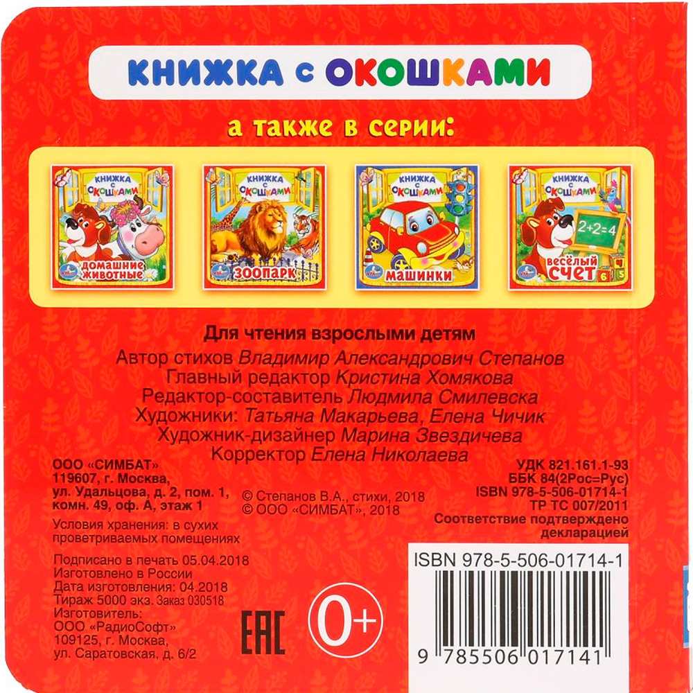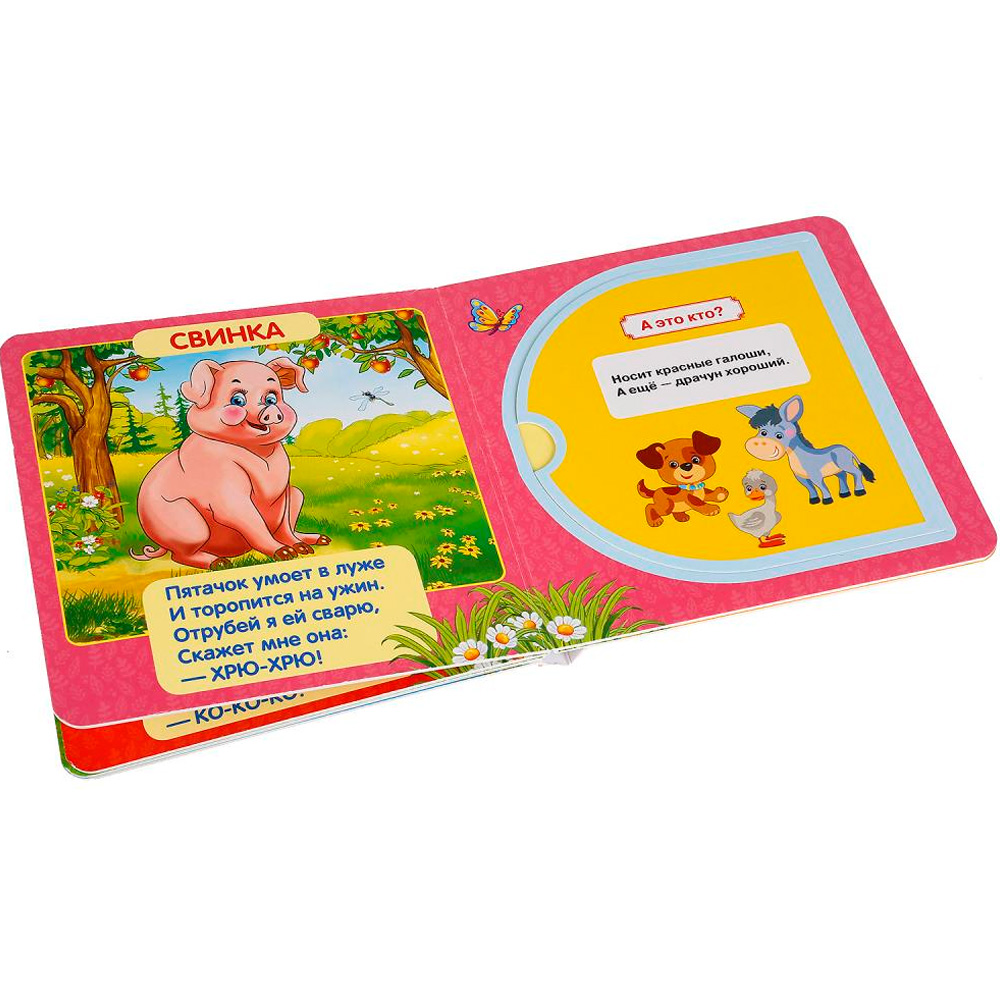 Книжка с окошками содержит веселые стихи и окошки, за которыми спрятались забавные персонажи. Серия книжек с окошками развивает моторику и внимание. Маленькие окошки-сюрпризы, которые малыши просто обожают открывать и отгадывать, что за ними спрятано, помогут закрепить знания. В книжке прекрасные яркие картинки. Страницы сделаны из плотного картона, поэтому листать книжку будет удобно даже самым маленьким, а книжка еще долго не утратит свой первоначальный внешний вид. С книжкой очень интересно проводить время, а чтение будет укреплять память, развивать воображение, зрительное и слуховое восприятие, внимание и усидчивость.