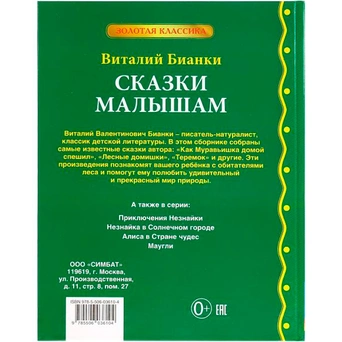 В сборник вошли известные и увлекательные сказки о животных и природе Виталия Бианки. Такое издание станет прекрасным подарком и украшением домашней библиотеки. Дети любят сказки, ведь в них добро всегда побеждает зло, а истории всегда хорошо заканчиваются. Ваш малыш вместе со сказочными героями перенесется в волшебный мир сказок. Сказки - это и уроки доброты, милосердия, справедливости. Они учат детей проявлять житейскую мудрость, отличать добро от зла и помогут формировать другие положительные качества. Читать книги детям полезно с самого раннего возраста. Это стимулирует их воображение, позволяет успокоить и разнообразить досуг.