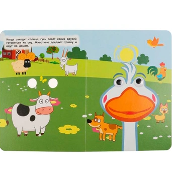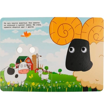 На каждой странице у героев на месте глаз - прорези, на последней странице - пластиковые глазки с подвижными зрачками.