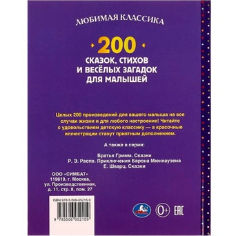 Возраст ребенка: Рекомендовано детям дошкольного возраста. Книга "200 сказок, стихов, потешек и загадок для дошкольника" из серии "200 сказок и стихов" ТМ "УМка" - отличный подарок для ребёнка:- задорные потешки- стихи разных поэтов: А. К. Толстой, А. Н. Плещеев, И. П. Токмакова, М. Л. Моравская, М. В. Дружинина, В. А. Степанов, В. Д. Берестов, А. А. Фет, Саша Чёрный- сказки и рассказы С. Г. Козлова, К. Д. Ушинского, М. М. Пришвина, Л. Н. Толстого, В. В. Бианки, К. Г. Паустовского- басни И. А. Крылова- красочные крупные иллюстрации- твёрдый переплёт. Яркий сборник разнообразных произведений известных авторов займёт достойное место в детской библиотеке. Интересные сказки, стихи и загадки обязательно заинтересуют ребёнка, а красочные картинки сделают чтение ещё более приятным. Чтение