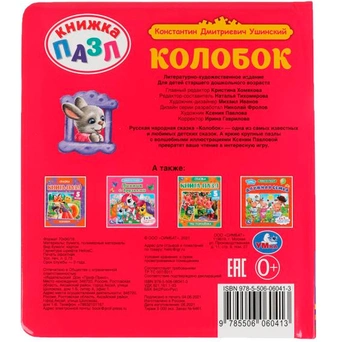 Книга-пазл «К. Д. Ушинский. Колобок» полезный подарок для детей дошкольного возраста. Малышам будет интересно и весело листать книжку, рассматривая яркие картинки, слушать сказку про колобок, а также собирать пазл.