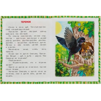 Крупный шрифт, поделенные на слоги слова, проставленные знаки ударения, разбитый на небольшие отрывки текст и красочные иллюстрации помогут малышу с удовольствием включиться в процесс чтения.