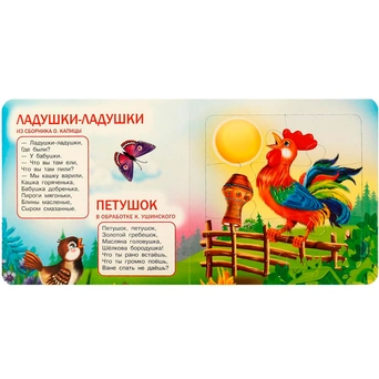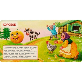 На каждом развороте малышу предлагается собрать красочный пазл по сюжету сказки.