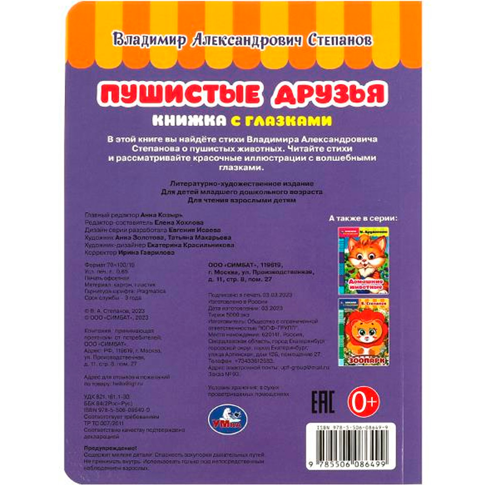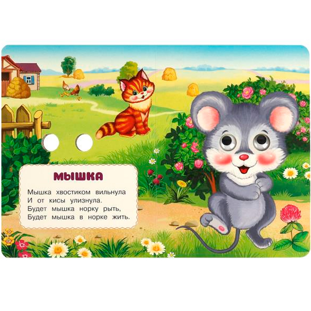 На каждой странице у героев на месте глаз - прорези, на последней странице - пластиковые глазки с подвижными зрачками.