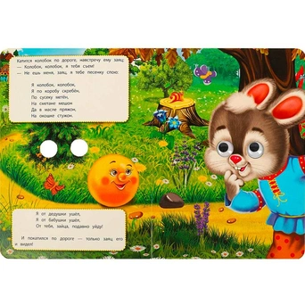 На каждой странице у героев на месте глаз - прорези, на последней странице - пластиковые глазки с подвижными зрачками.