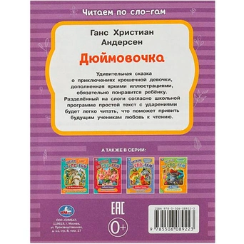 В книгу вошла сказка о приключениях Дюймовочки для первого самостоятельного чтения детьми.