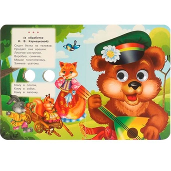 На каждой странице у героев на месте глаз - прорези, на последней странице - пластиковые глазки с подвижными зрачками.