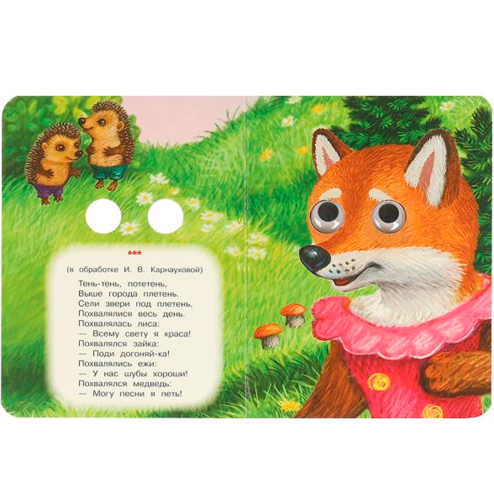 На каждой странице у героев на месте глаз - прорези, на последней странице - пластиковые глазки с подвижными зрачками.