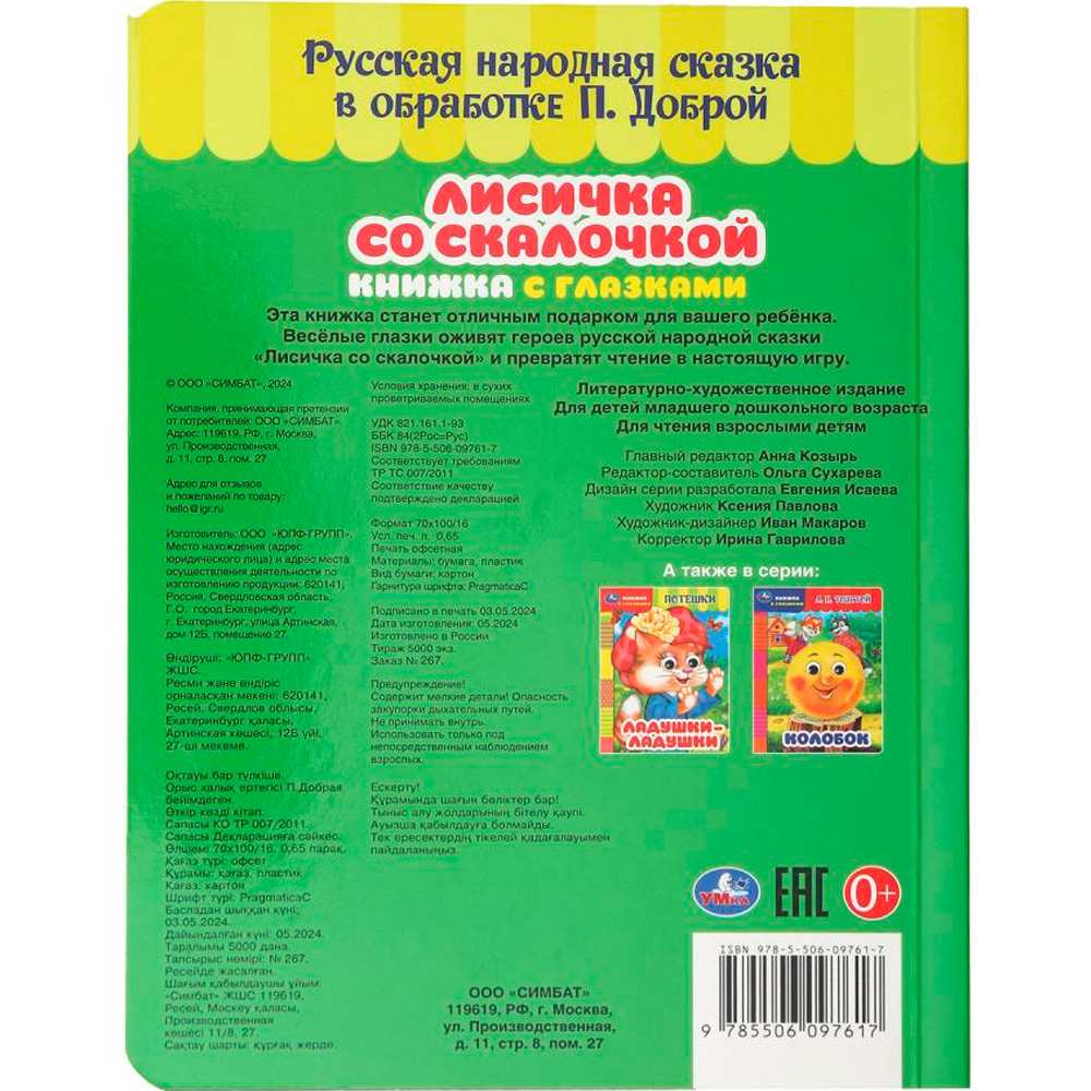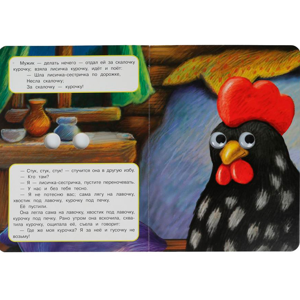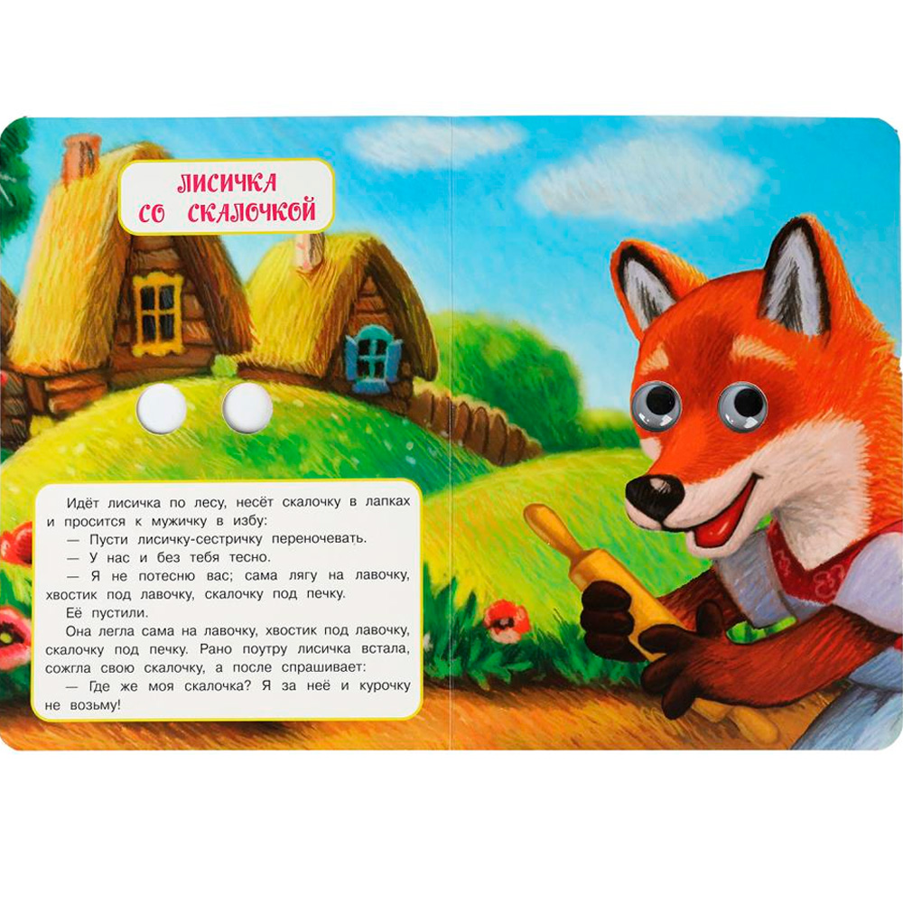 На каждой странице у героев на месте глаз — прорези, на последней странице — пластиковые глазки с подвижными зрачками.