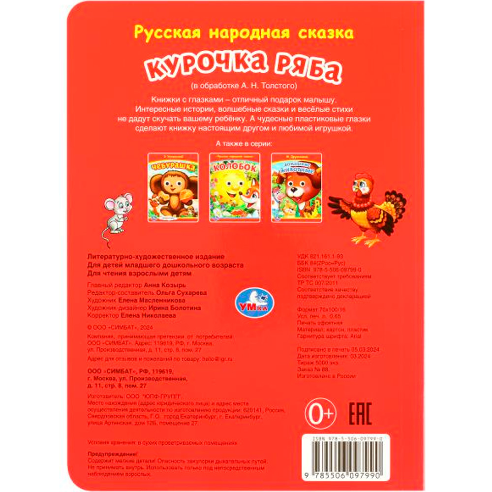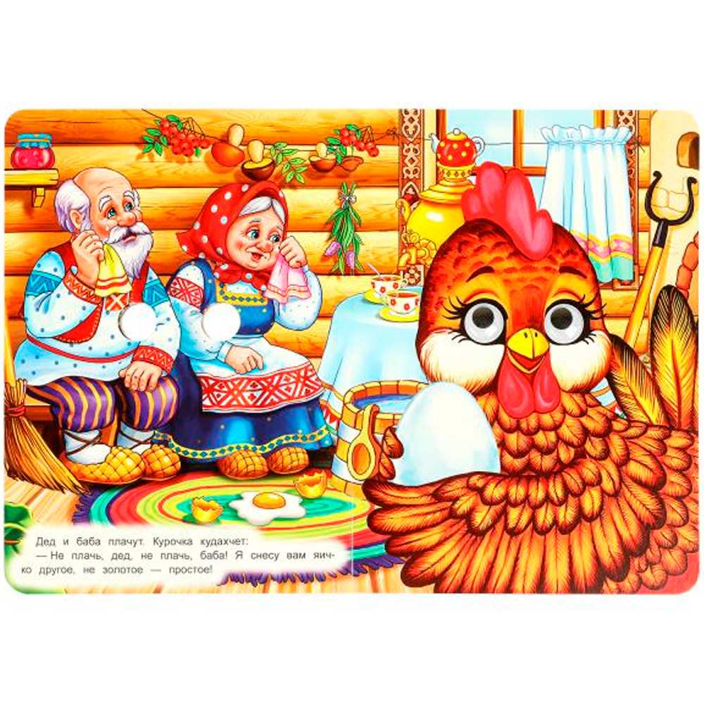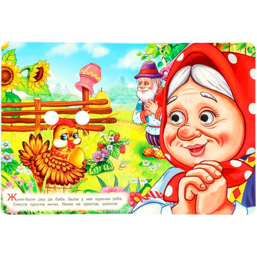 На каждой странице у героев на месте глаз — прорези, на последней странице — пластиковые глазки с подвижными зрачками.