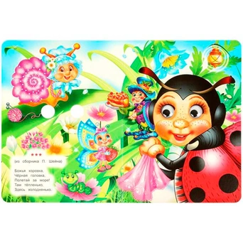 На каждой странице у героев на месте глаз — прорези, на последней странице — пластиковые глазки с подвижными зрачками.