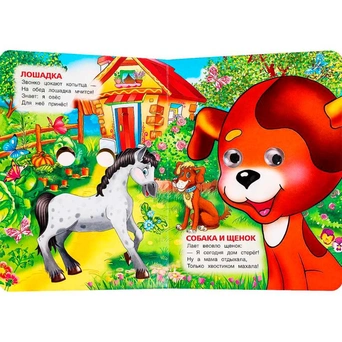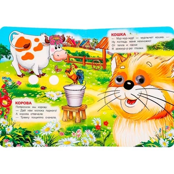 На каждой странице у героев на месте глаз — прорези, на последней странице — пластиковые глазки с подвижными зрачками.