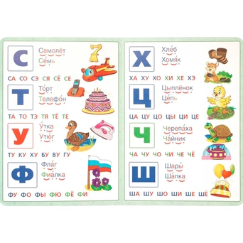 Ярко проиллюстрированная книжка-картонка познакомит малышей с буквами русского алфавита и научит читать по слогам.