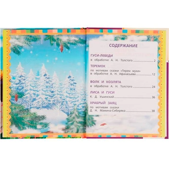 5 сказок: «Гуси-лебеди» и «Волк и козлята» в обработке А. Н. Толстого, «Теремок» по мотивам сказки «Терем мухи» в обработке А. Н. Афанасьева, «Лиса и гуси» в обработке К. Д. Ушинского, «Храбрый заяц» по мотивам сказки Д. Н. Мамина-Сибиряка.