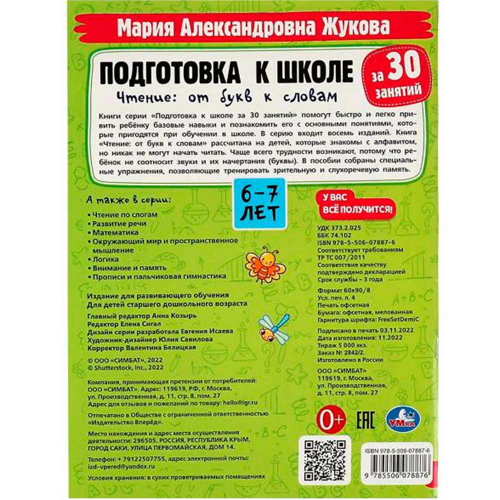 Книга Умка 9785506078876 Подготовка к школе за 30 занятий. Чтение: от букв к словам.6-7лет. Жукова М.А
