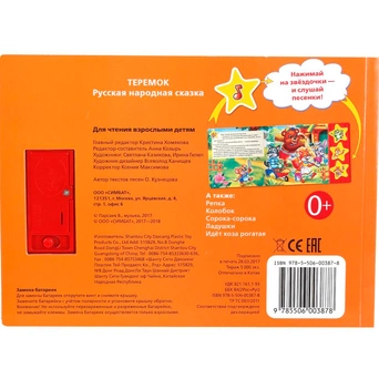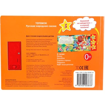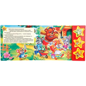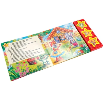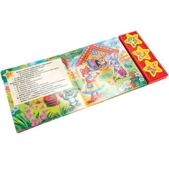 Книжка с тремя музыкальными кнопками расскажет веселые сказки. В книгу встроен звуковой модуль, который активируется при нажатии на одну из трех кнопочек. Кнопки большие, с красивыми рисунками и сделаны в виде звездочек, поэтому ребенку будет приятно играть с ними, пока взрослый читает ему книгу. Текст сделан крупным, чтобы дети постарше могли научиться читать его. Книга сделана из плотного картона и качественно иллюстрирована. Такую книгу будет очень интересно читать и разглядывать, а также развивать мелкую моторику и цветовое восприятие. Книга снабжена яркими красочными иллюстрациями. Книжка небольшого размера, ее очень удобно держать в руках. Издание имеет безопасный и удобный формат. Чтение способствует тренировке
