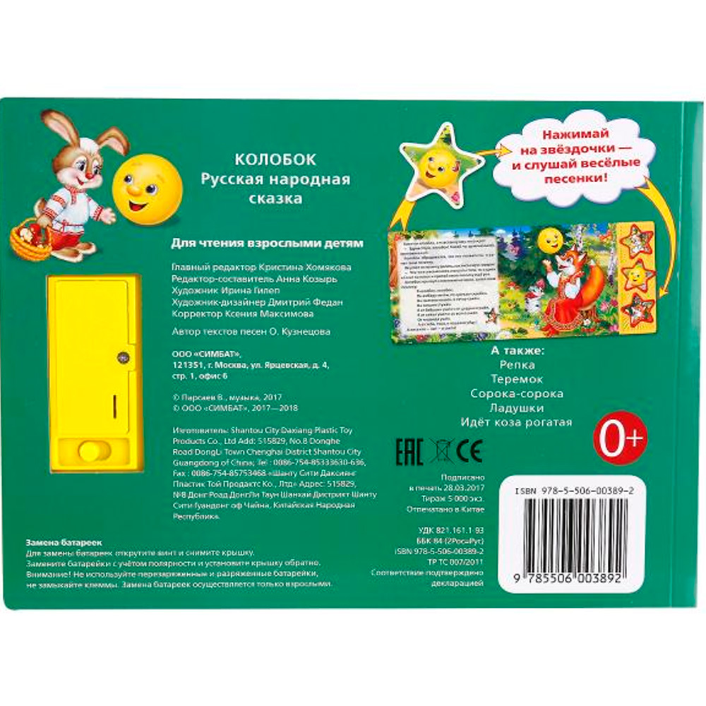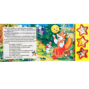 Книга расскажет малышам занимательную народную сказку. Родители могут зачитывать занимательную историю, в то время как малыш будет обогащать свой словарный запас, воображение и память, попутно с интересом разглядывая красочные картинки из книги. Текст адаптирован для самых маленьких читателей. Книжка небольшого размера, ее очень удобно держать в руках. Странички изготовлены из плотного картона, так что помять или порвать ее будет не так просто. В издании имеются звуковые кномпи в виде звезд, нажав на которые, можно послушать песенку из мультфильма и услышать голоса любимых героев. При повторном нажатии на кнопку песенка останавливается. Такую книжку малыш захочет перечитывать снова и снова. Тем самым будут тренироваться память, усидчивость, слуховое и з
