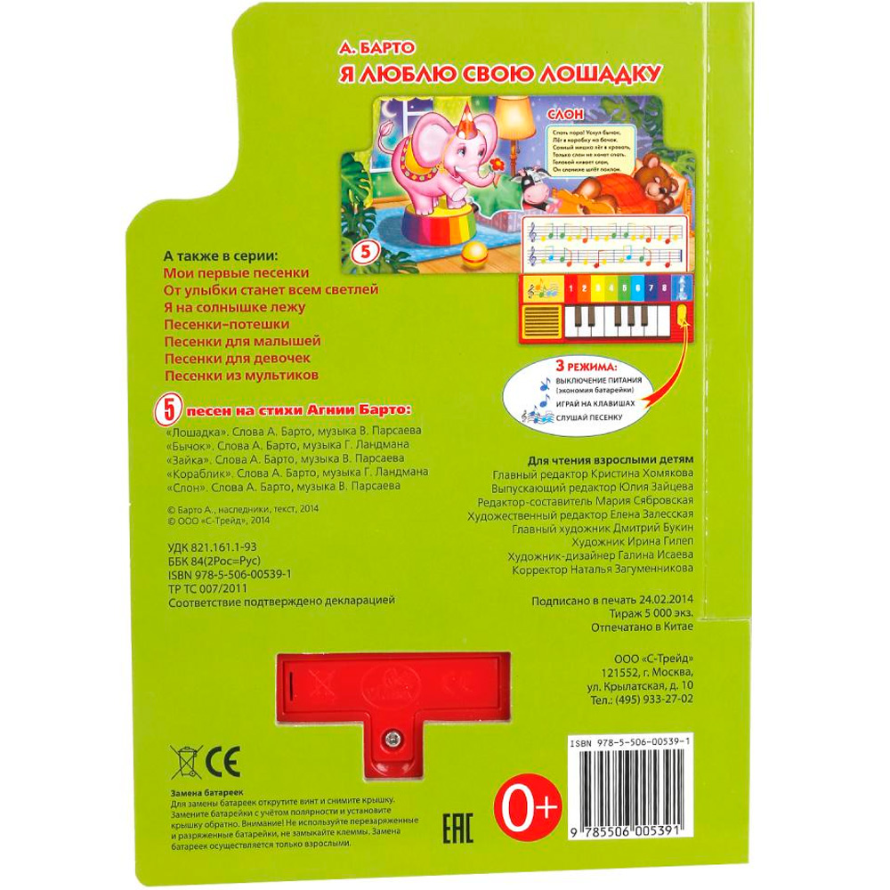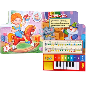 Книжка с музыкальным модулем и клавишами пианино позволит малышу занимательно провести время. Звуковой модуль активируется при нажатии на кнопки и позволяет прослушать веселые песенки. Клавиши пианино позволят ребенку проиграть мелодии самостоятельно. Текст сделан крупным, чтобы дети постарше могли научиться читать его. Книга сделана из плотного картона и качественно иллюстрирована. Такую книгу будет очень интересно читать и разглядывать, а также развивать мелкую моторику и цветовое восприятие. Книжка небольшого размера, ее очень удобно держать в руках. Издание имеет безопасный и удобный формат. Чтение способствует тренировке памяти, усидчивости, слухового и зрительного восприятия, мелкой моторики рук.