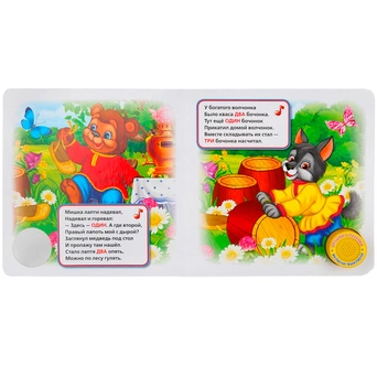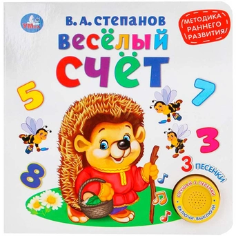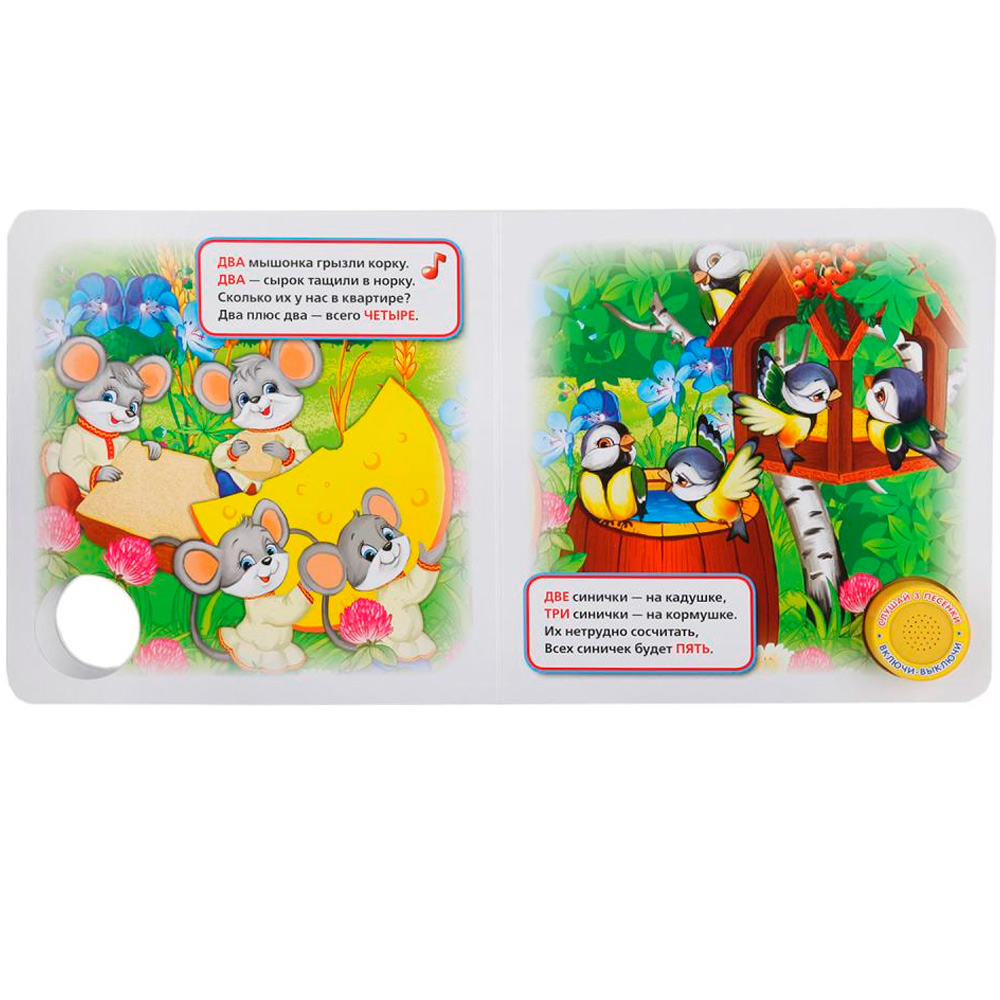 Книжка с вырубкой и кнопкой познакомит малышей с цифрами и счетом. Она содержит занимательные стихи. Книга расширяет кругозор малыша, тренирует слух, развивает внимание и память. Дети хорошо улавливают ритм, поэтому песенки для них — прекрасный вариант. Яркие картинки привлекут внимание, а юмористические строчки - позабавят и развлекут. При нажатии на кнопку раздается веселая песенка. Текст адаптирован для самых маленьких читателей.