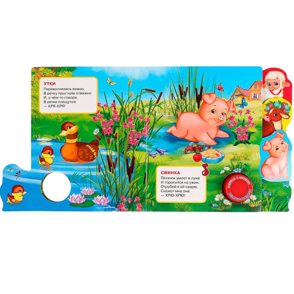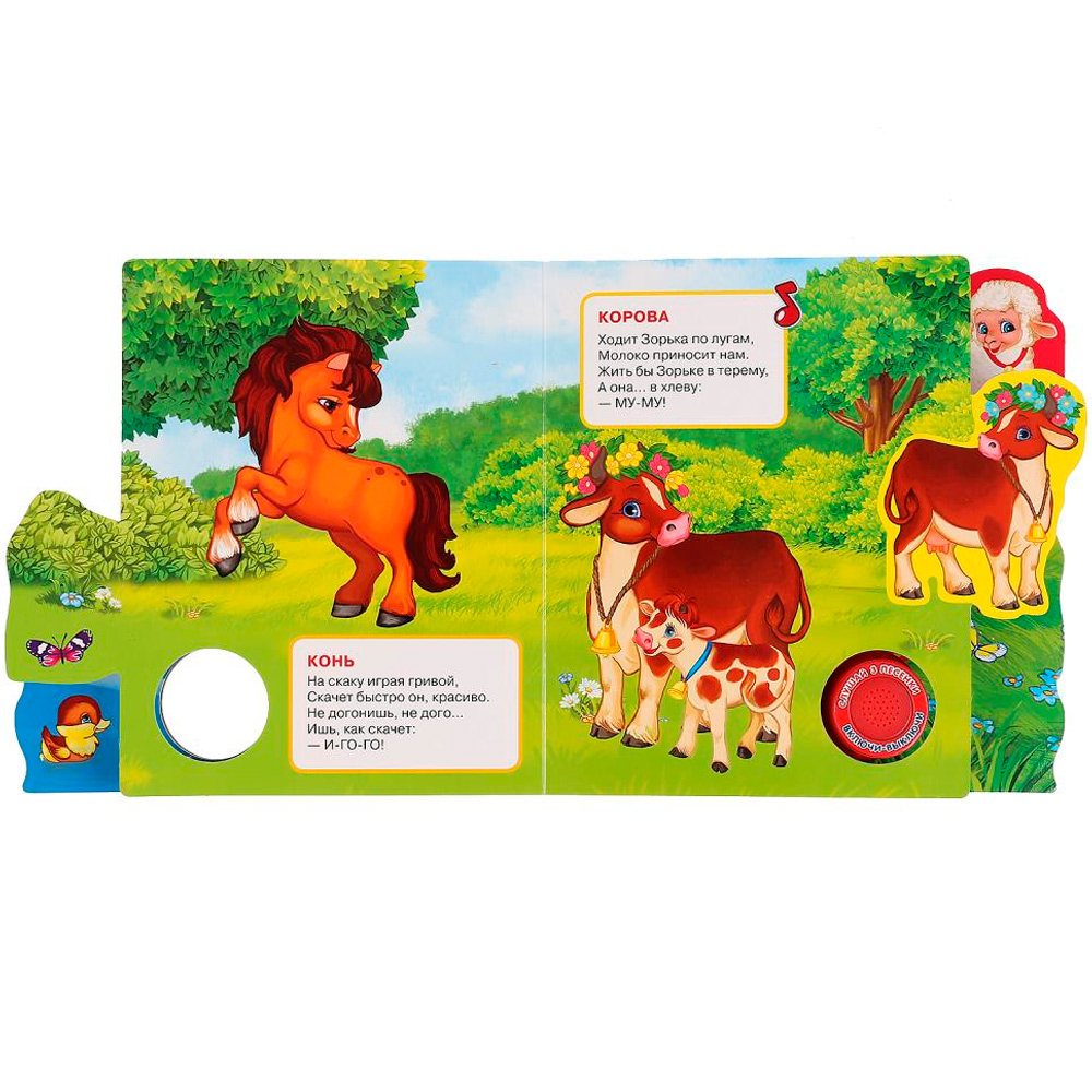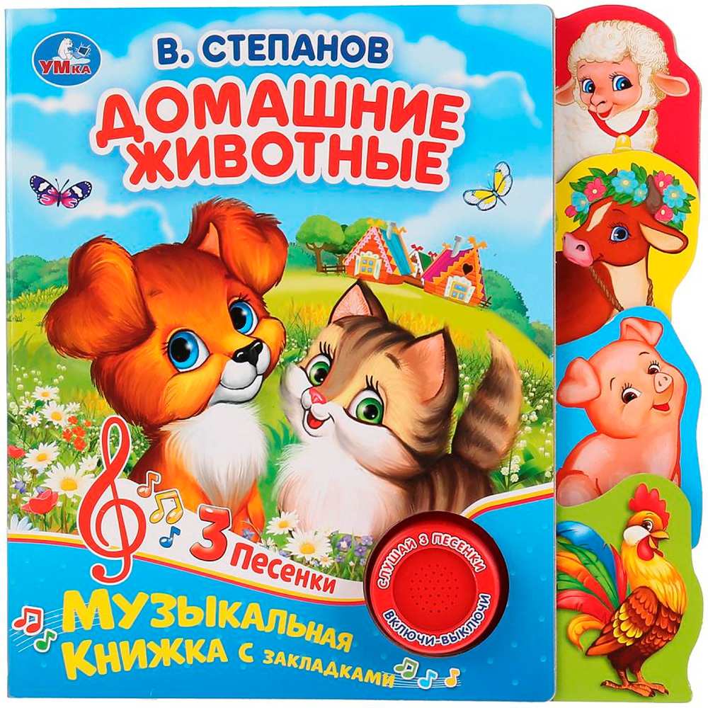 Красочная книжка содержит веселые песенки, яркие картинки, стихи и познакомит малышей с домашними животными. Звуковой модуль активируется при нажатии на кнопку. Книга выполнена из плотного картона и ярко иллюстрирована. Такую книгу будет очень интересно читать и разглядывать картинки, а также тренировать мелкую моторику и цветовое восприятие. Книжкаобладает удобным форматом. Издание имеет безопасный и удобный формат. Чтение способствует тренировке памяти, усидчивости, слухового и зрительного восприятия, мелкой моторики рук.