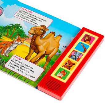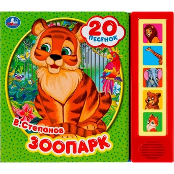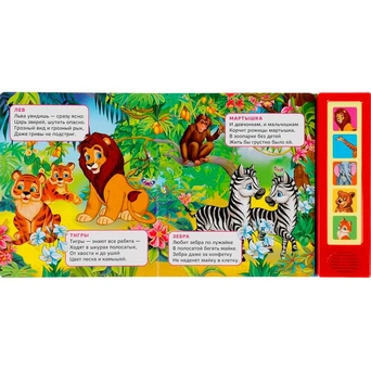 • Книжка с музыкальным модулем содержит занимательные стихи о животных и 20 песенок: «Лев», «Тигры», «Мартышка», «Зебра», «Жираф», «Кенгуру», «Бегемот», «Фламинго», «Слон», «Кабан» и др.