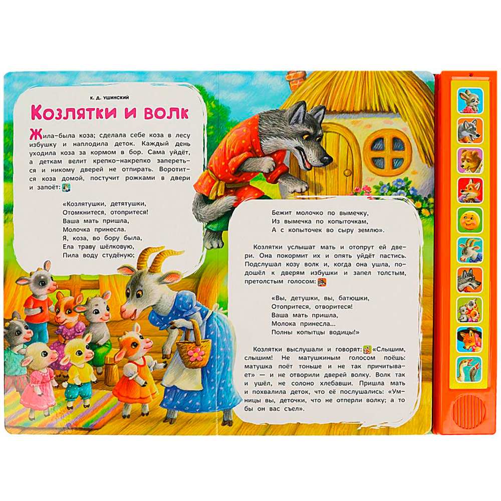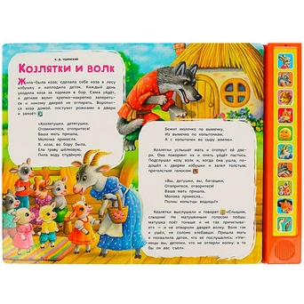 Книжка с музыкальным модулем содержит 3 увлекательные сказки: «Колобок», «Козлята и Волк», «Лиса и гуси», а 10 звуковых кнопок позволят послушать песенки.